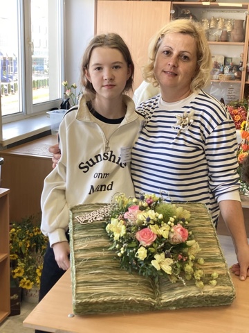 В очной номинации конкурса «Краски осени» в творческом тандеме педагог и учащаяся создали настольную композицию ко Дню учителя из срезанных живых цветов и зелени, с добавлением декоративных элементов ручной работы, овощей и фруктов. Основой для создания композиции стала раскрытая книга декорированная рогозом и плетёнными элементами из него. Жюри оценило старания конкурсанток дипломом второй степени Министерства образования Республики Беларусь.