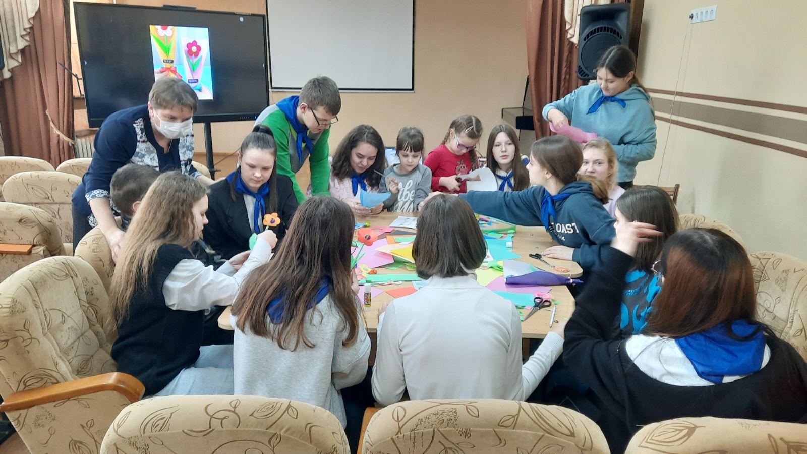 Накануне Международного женского праздника к ребятам из инклюзивного театра «Жемчужины» (руководитель Шевеленко Г.И.) пришли в гости волонтёры клуба «Поколение XXI» (руководитель Иващенко Л.П.) государственного учреждения образования «Волковысский центр творчества детей и молодёжи».